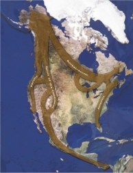 The map at right indicates projected “mega-linkages”, or proposed wildlife corridors for large keystone predator and prey species in North America. These maps were developed by The Wildlands Project, tireless advocates for “rewilding” the continent of North America by returning to conditions that existed 500 years ago.