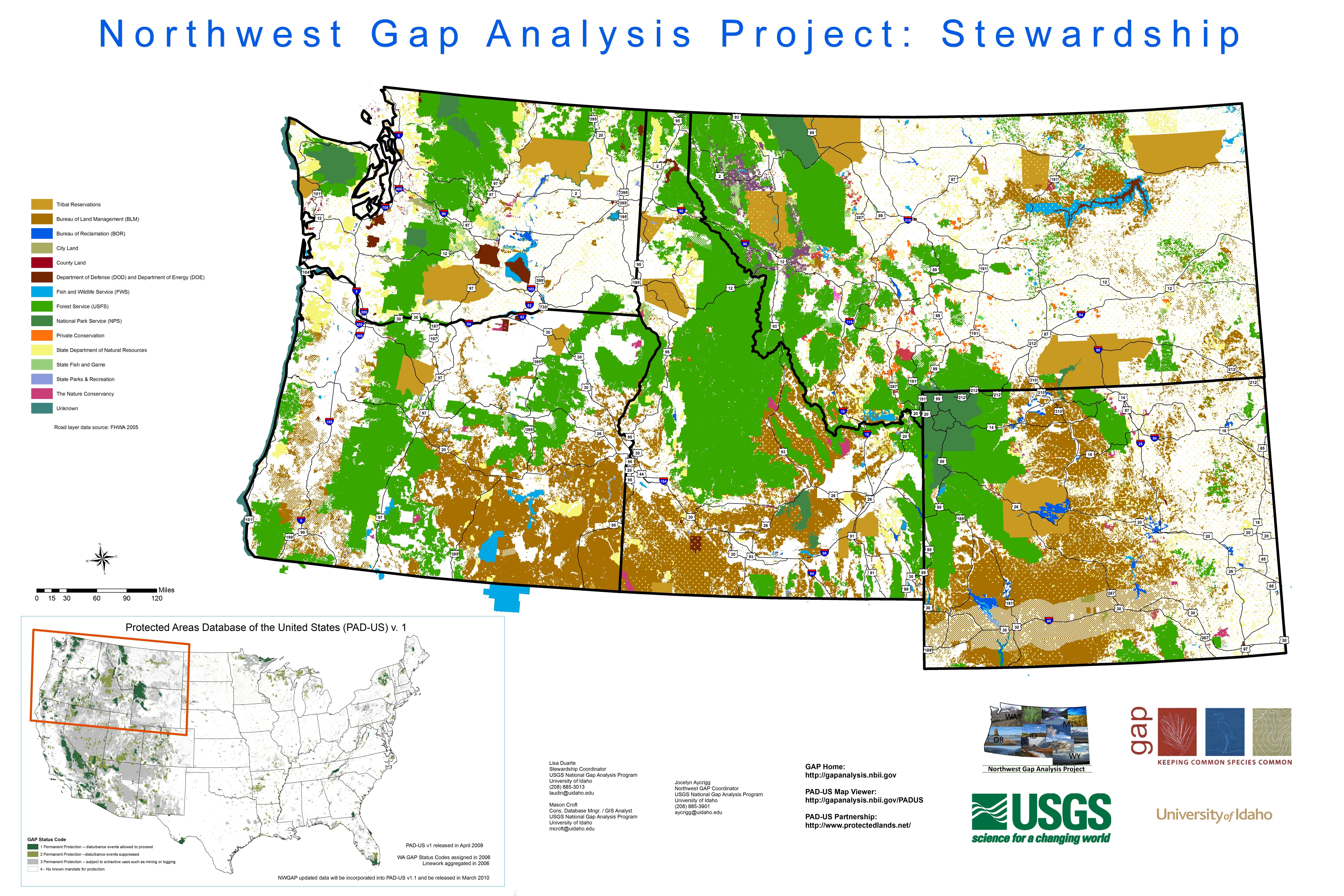 The Northwest Regional Gap Analysis Project (NWGAP) is an update of the Gap Analysis Program’s mapping and assessment of biodiversity for the five-state region encompassing Washington, Idaho, Oregon, Montana, and Wyoming. It is a multi-institutional cooperative effort coordinated by the U.S. Geological Survey Gap Analysis Program. The primary objective of the update is to use a coordinated mapping approach to create detailed, seamless GIS maps of land cover, all native terrestrial vertebrate species, land stewardship, and management status, and to analyze this information to identify those biotic elements that are underrepresented on lands managed for their long term conservation, in other words, “gaps”. This project began in September 2004. [http://gapanalysisprogram.com/]